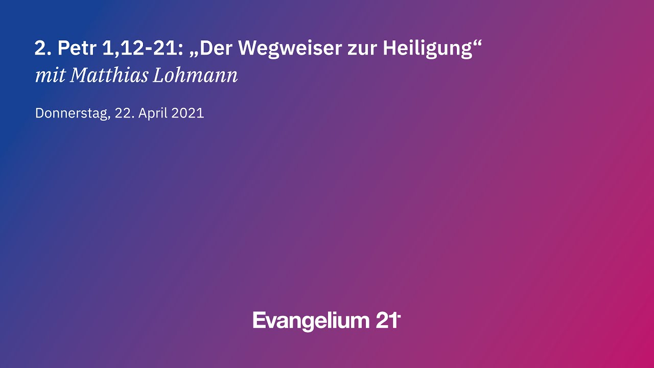 Bibel und Theologie Video Audio Der Wegweiser zur Heiligung Vortrag von Matthias Lohmann 22. April 2021 Der E21-Podcast kann auch auf Spotify oder iTunes abonniert werden. Ein Vortrag von Matthias Lohmann auf der Hauptkonferenz 2021 in Hamburg.