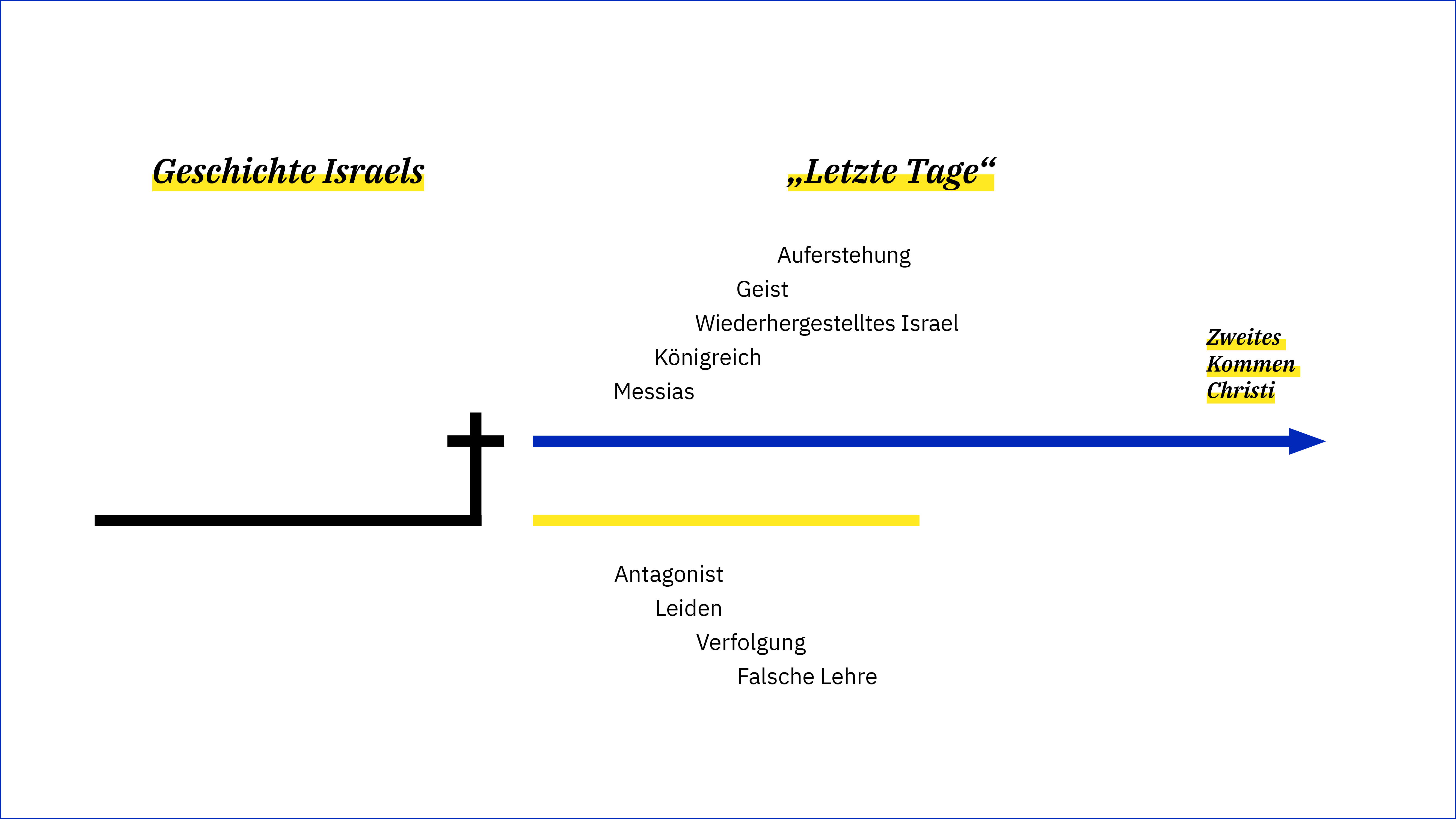 Einer der auffälligsten Aspekte des Neuen Testaments ist das Beharren der Apostel darauf, dass die „letzten Tage“ in die Geschichte eingebrochen sind. Auf die eine oder andere Weise geht jedes neutestamentliche Buch davon aus, dass die letzte Epoche der Geschichte Israels durch die Person Christi begonnen hat. All das, was das Alte Testament für die Endzeit vorausgesagt hat, hat sich mit dem ersten Kommen Christi zu erfüllen begonnen und dauert bis zu seinem zweiten Kommen weiter an. Die alttestamentlichen Endzeiterwartungen – die große Trübsal, Gottes Unterwerfung der Heiden, die Befreiung Israels von den Unterdrückern, die Wiederherstellung und Auferstehung Israels, der neue Bund, der verheißene Geist, die neue Schöpfung, der neue Tempel, ein messianischer König und die Errichtung des Reiches Gottes – sind durch den Tod und die Auferstehung Christi in Gang gesetzt worden.