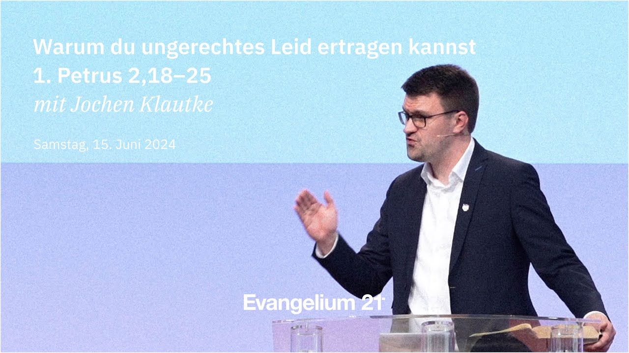 Bibel und Theologie Video Audio 1. Petrus 2,18–25 Vortrag von Jochen Klautke 15. Juni 2024 Der E21-Podcast kann auch auf Spotify oder iTunes abonniert werden. Ein Vortrag von Jochen Klautke auf der Hauptkonferenz 2024 in Hamburg.