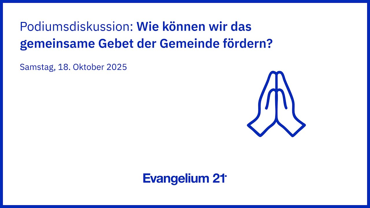 Gemeinde Video Audio Wie können wir das gemeinsame Gebet der Gemeinde fördern? Interview mit Markus Matthes und Peter Krell 18. Oktober 2025 Der E21-Podcast kann auch auf Spotify oder iTunes abonniert werden. Eine Podiumsdiskussion auf der E21-Regionalkonferenz Südost 2025